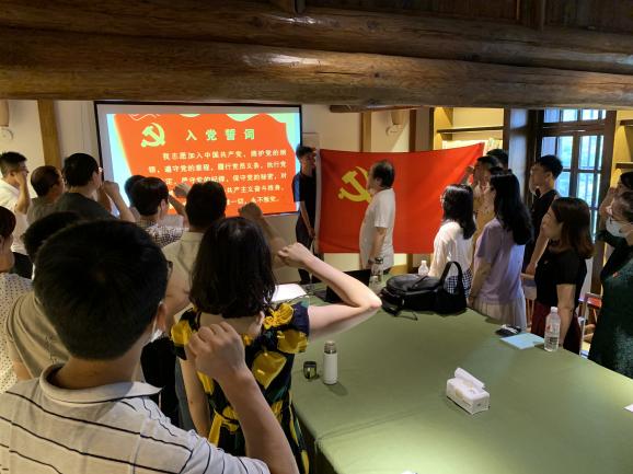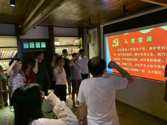 参观结束后,在大陈村萃文中学旧址,在机电工程学院党总支书记朱峻同志领誓下,42位党员教师们重温了入党誓词,铭记那一年许下的誓言:“我志愿加入中国共产党……随时准备为党和人民牺牲一切,永不叛党。”铿锵恢宏的誓词,强烈震撼着在场的每一位党员,一字一句,神圣而豪迈,铮铮誓言,体现了党员同志们对中国共产党的无限忠诚,坚定了入党使命,奋斗初心。