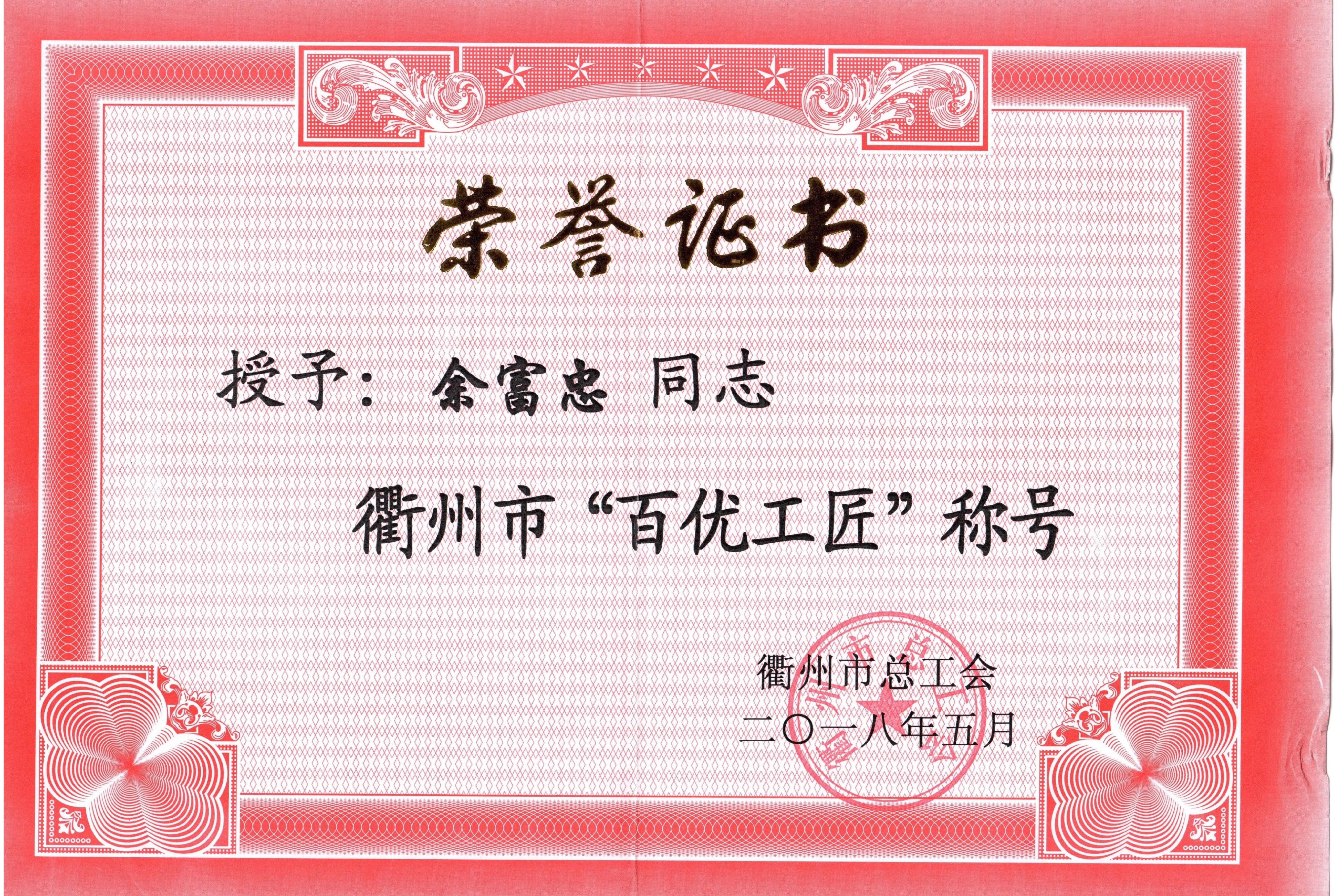 余富忠被评为衢州市“百优工匠”
