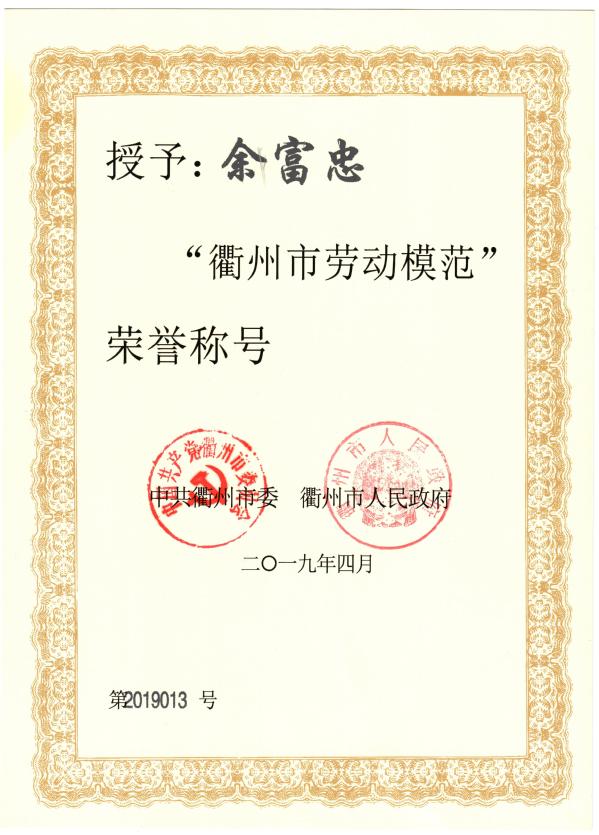 余富忠被评为“衢州市劳动模范”