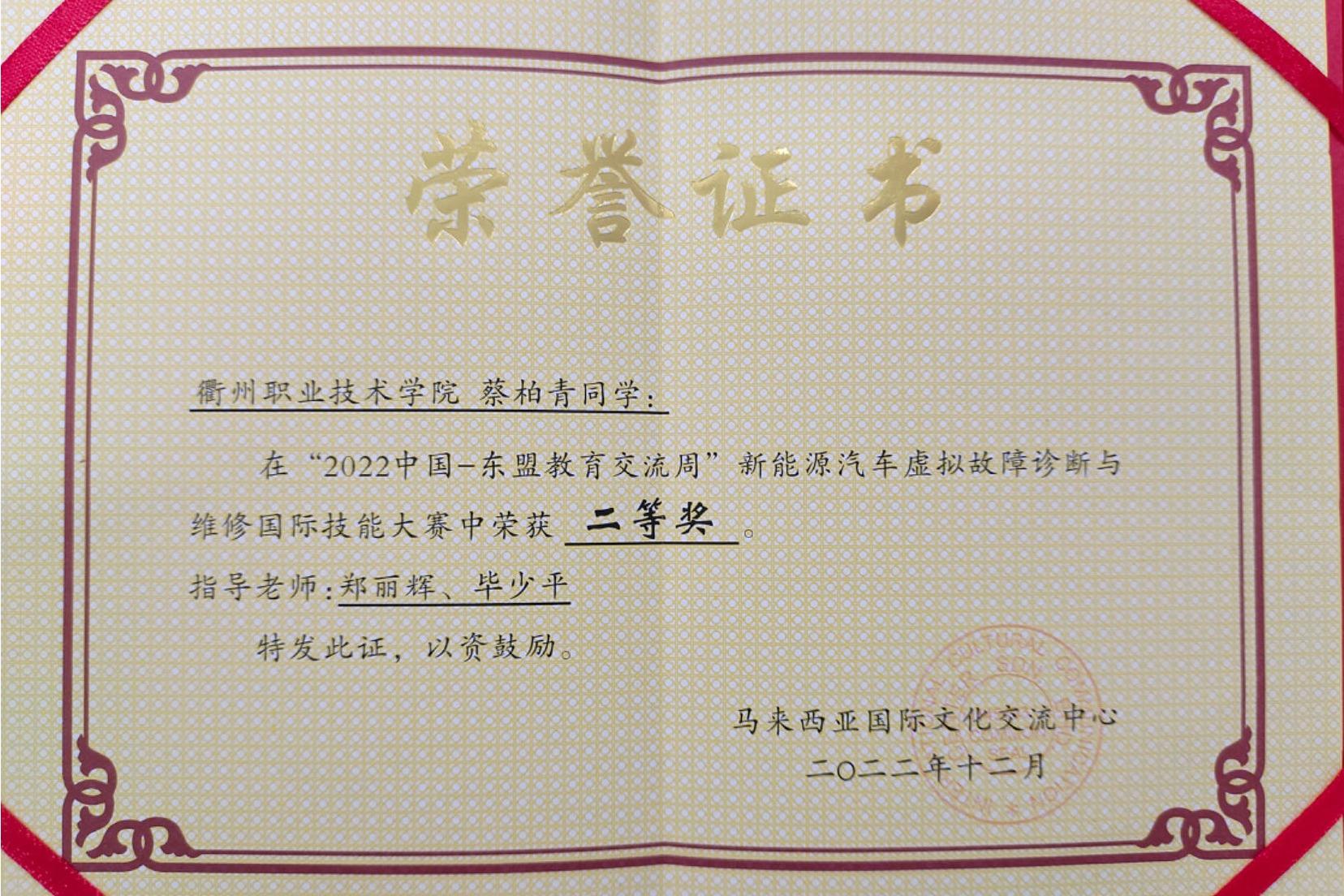 郑丽辉、毕少平指导学生获“2022中国-东盟教育交流周”新能源汽车虚拟故障诊断与维修国际技能大赛二等奖