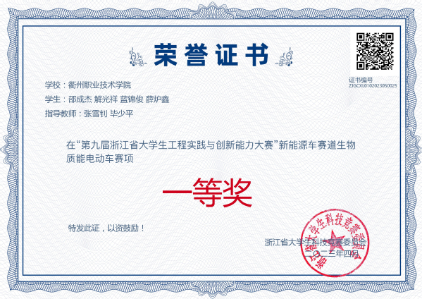 张雪钊、毕少平指导学生获第九届浙江省大学生工程实践与创新能力大赛一等奖
