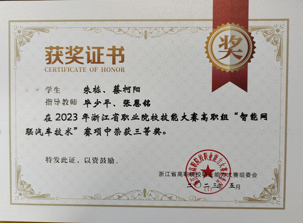 毕少平指导学生获2023浙江省高职学生技能竞赛智能网联汽车项目三等奖