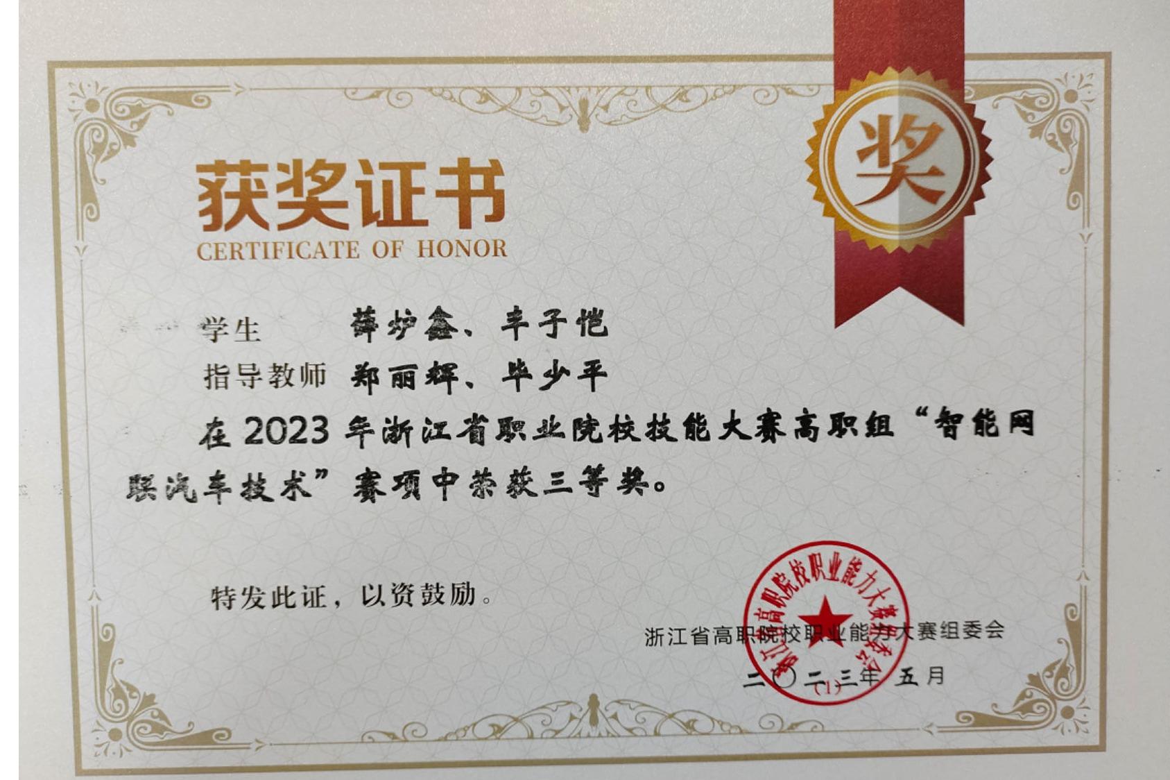 郑丽辉、毕少平指导学生获2023年浙江省职业技能智能网联三等奖