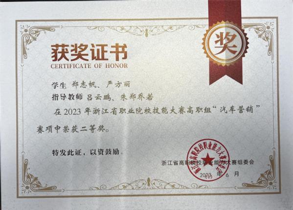 吕云鹏、朱郑乔若指导学生获2023年浙江省职业院校技能大赛高职组“汽车营销”赛项二等奖