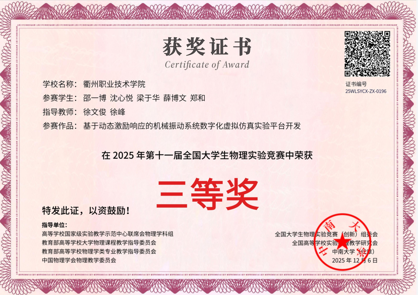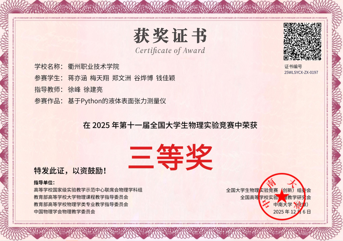 这是我校首次在该赛事中同时拿下三项大奖,实现了物理类学科竞赛国家级奖项的历史性突破!
