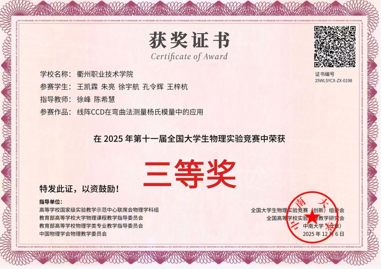 自选类 | 线阵CCD在弯曲法测量杨氏模量中的应用 | 王凯霖,朱亮,徐宇航,孔令辉,王梓杭 | 徐峰,陈希慧 | 衢州职业技术学院 | 全国三等奖 |